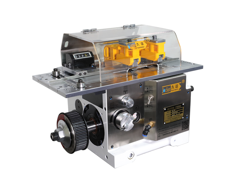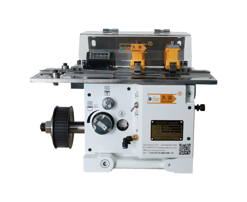 JSG系列是通過凸輪驅動,具有可調性的挾式送料。采用一個弧面凸輪和三個板型凸輪的獨特設計方式,實現了高速平穩送料。為了使材料均勻受力,避免產生壓痕和擦傷,對挾具進行了特別加工,可以輸送易碰傷的電鍍材料、軟質材料以及不規則形狀的材料等。特別適合于電子產業中的材料輸送。
